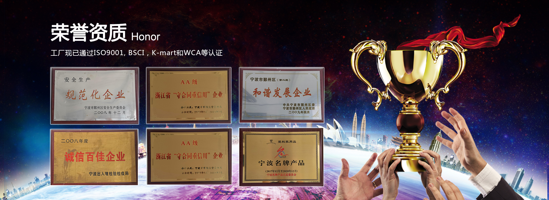 工廠現(xiàn)已通過ISO9001, BSCI,K-mart和WCA等認證。